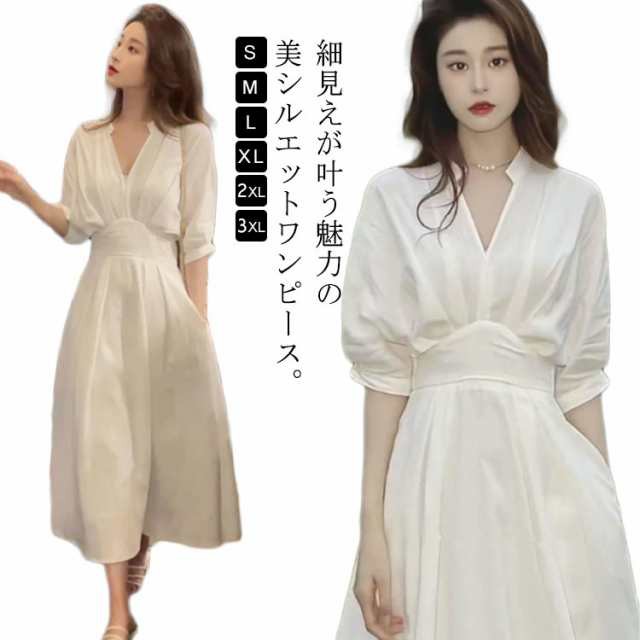 レディース ワンピース Vネック シャツワンピース 5分袖 スキッパーカラー 上品 お洒落 ホワイト ウェストシェイプ 無地 着痩せ タック入り ウェストシェイプ オフィスカジュアル 普段着 通勤 ビジネス お出かけ 春 夏 エレガント