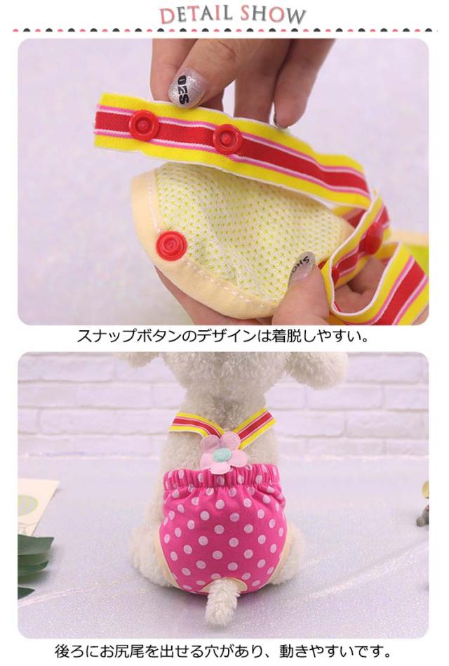 | 上品で可愛らしいパンツはいつも大人気! 裏地にはメッシュ生地で通気性と吸汗性に優れ、肌に優しくて蒸れない。 スナップボタンのデザインは着脱しやすい。 後ろにお尻尾を出せる穴があり、動きやすいです。 水洗い可能なので、ペットも快適に過ごすことができます。 愛犬の生理時・オムツカバー・術後の保護としてもお使いいただけます。 マーキング防止、女の子に生理期、雄の犬の発情期や老犬の介護用に役立ちます。 | |