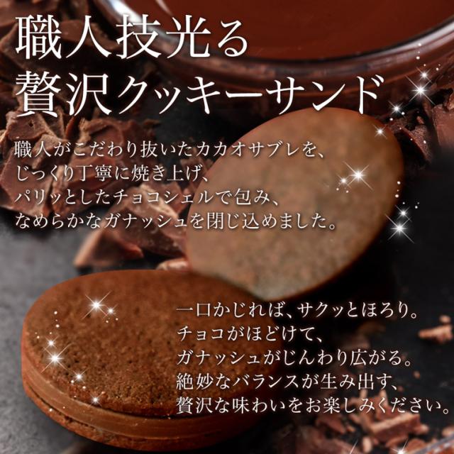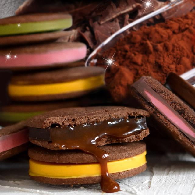 ひと口ごとに幸せ広がる魔法のクッキーサンド。サックリとした食感の香ばしいチョコクッキーに、とろけるようになめらかなガナッシュをサンドしました。深みのあるとろ〜り濃厚キャラメル、フルーティで華やかなフランボワーズ、奥深い甘み広がる抹茶、上品な甘さのストロベリー、リッチでまろやかな味わいのミルク、色鮮やかで爽やかなオレンジ。個性溢れる6つの味わいは選ぶ時間も楽しいひととき。ご自宅でのご褒美タイムにも、大切な方への贈り物にもふさわしい、上質なクッキーサンドです。