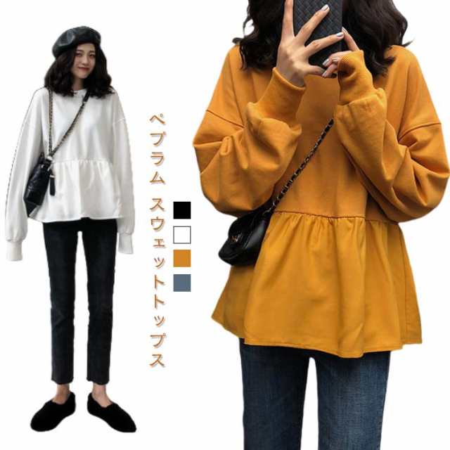 夏 レディース スウェット 長袖 スウェット トップス ペプラムトップス トレーナー 春夏 黒 春 白 オフィス チュニック ゆったり ビッグシルエット ペプラム ホワイト ブラック キャメル ブルー 大人 体型カバー ブラウス 20代 30代 40代 ママ 母