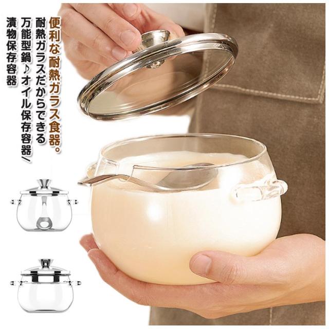 800ml 深型 オイル保存容器 小鍋 両手鍋 スープポット 耐熱ガラス オイルポット ガラス鍋 こし網付き 鍋 なべ 両手鍋 調理器具 香料 漬物保存容器 スプーン付き 多機能