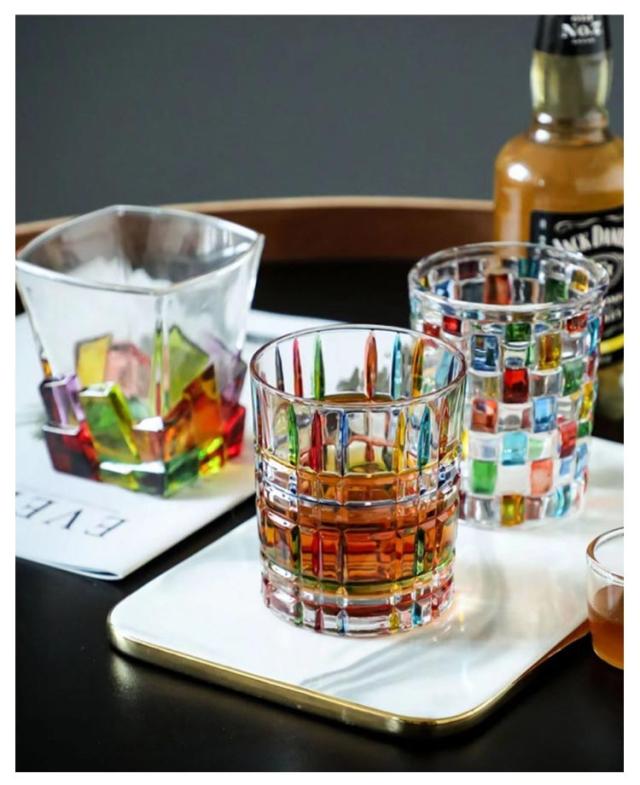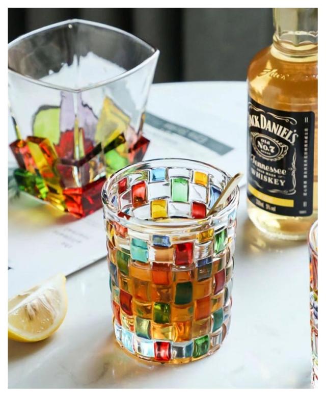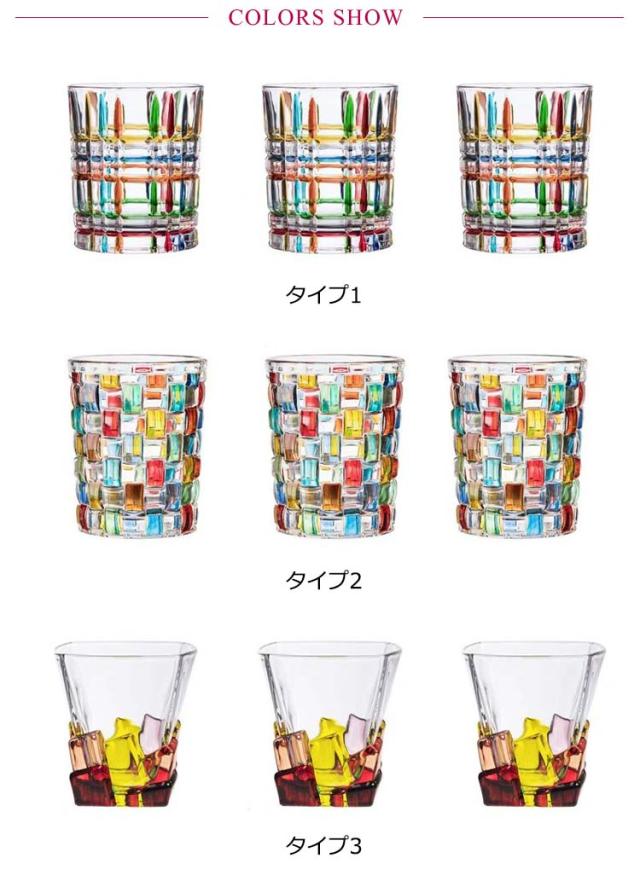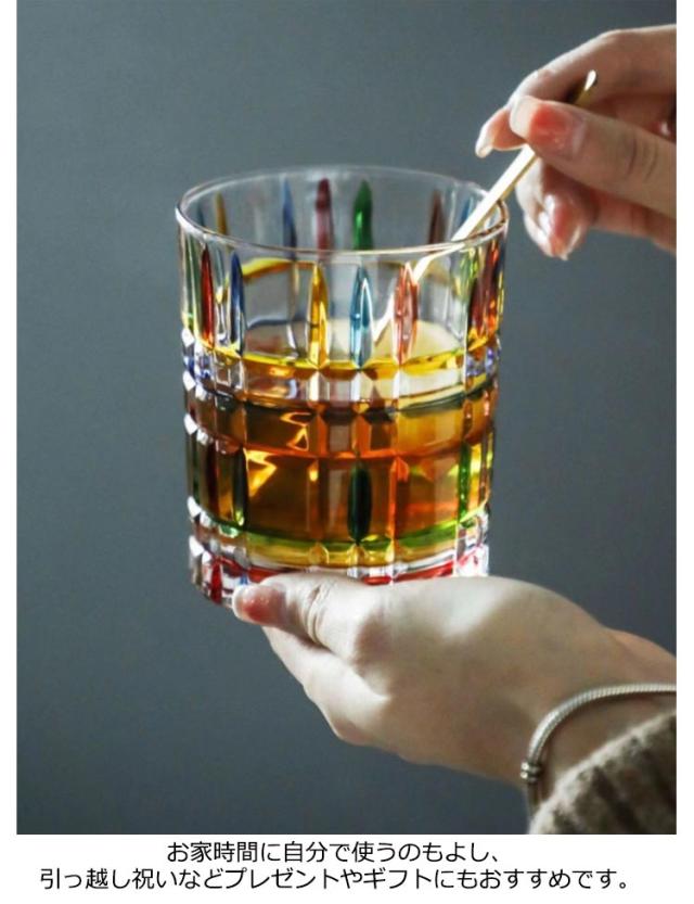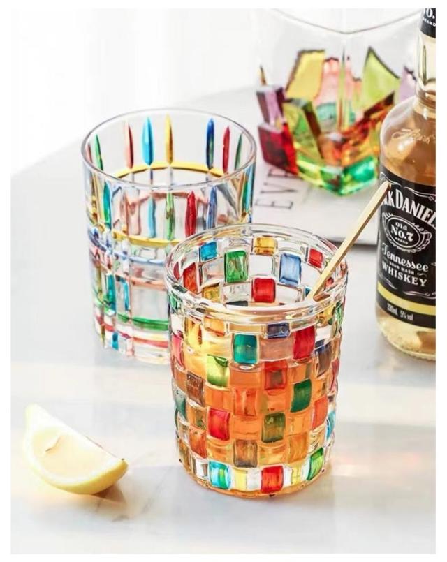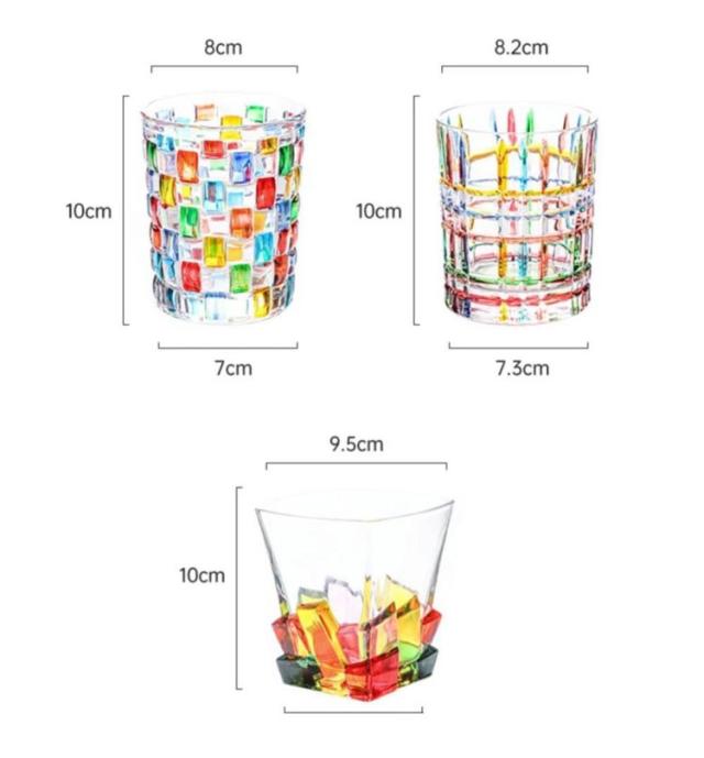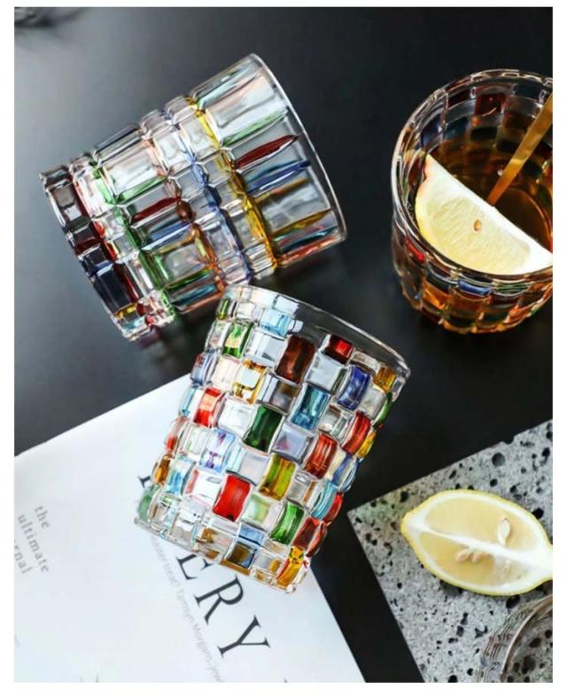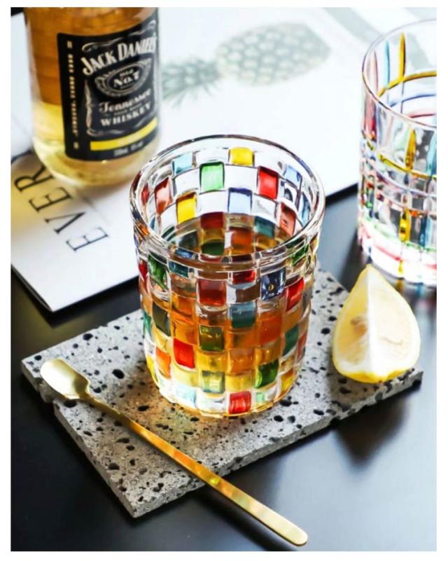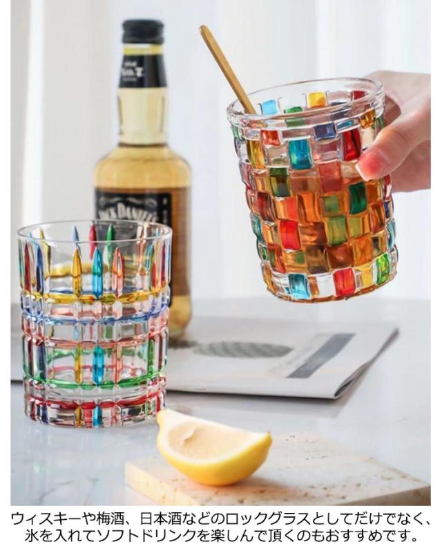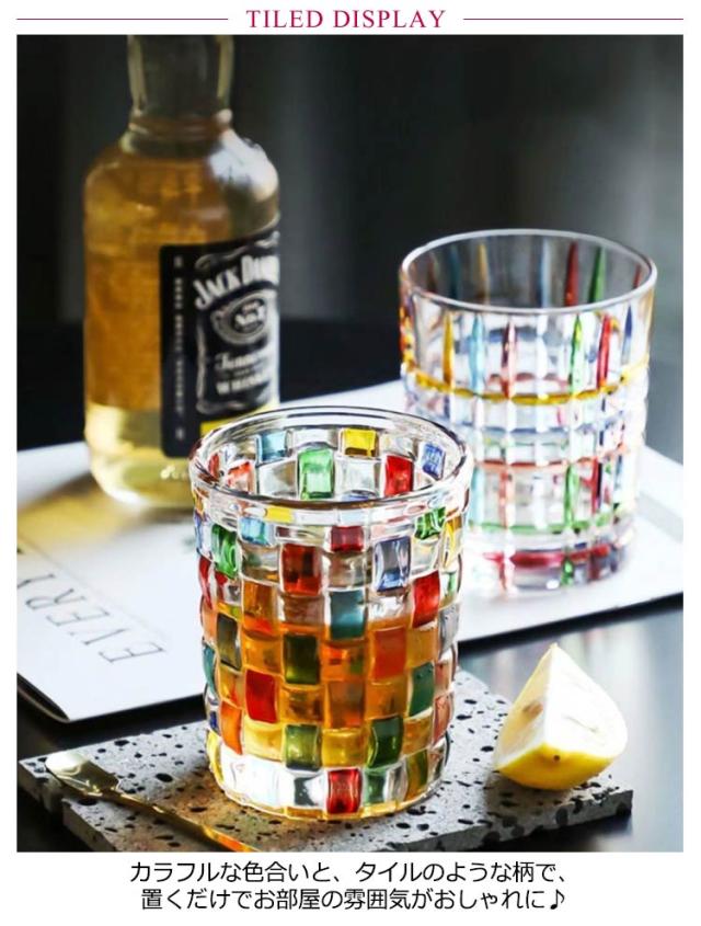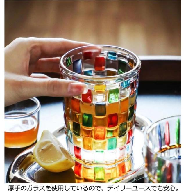 | ヴィンテージ風のガラスタンブラー。【3個セット】 カラフルな色合いと、タイルのような柄で、置くだけでお部屋の雰囲気がおしゃれに♪ 厚手のガラスを使用しているので、デイリーユースでも安心。 ウィスキーや梅酒、日本酒などのロックグラスとしてだけでなく、氷を入れてソフトドリンクを楽しんで頂くのもおすすめです。 お家時間に自分で使うのもよし、引っ越し祝いなどプレゼントやギフトにもおすすめです。 | |