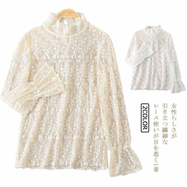 送料無料 レースブラウス レディース レーストップス レースインナー 長袖 タートルネック フリル袖 透け感 レイヤード コーデ 重ね着 薄手 チュールレース インナー フォーマル 大人 おしゃれ かわいい セクシー