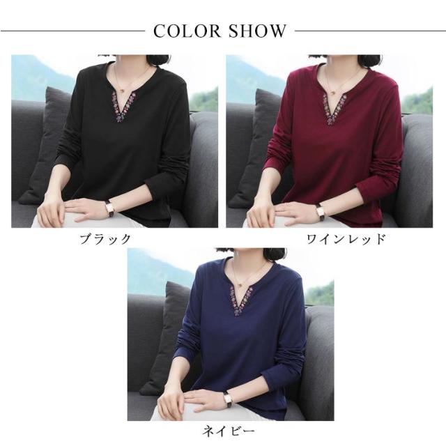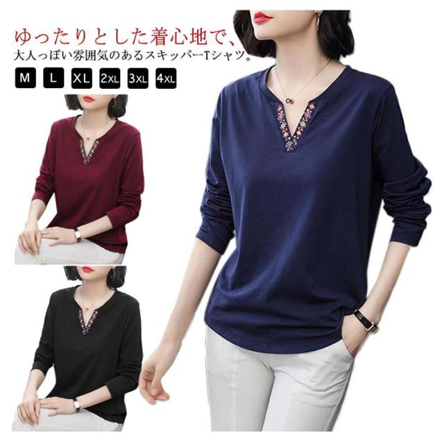 カットソー キーネック 刺? Tシャツ 長袖 Tシャツ トップス レディース ブラウス キーネック Vネック プルオーバー エスニック スキッパー シャツ 花柄 ロンT カットソー チュニック 送料無料 大人 可愛い ブラック ワインレッド