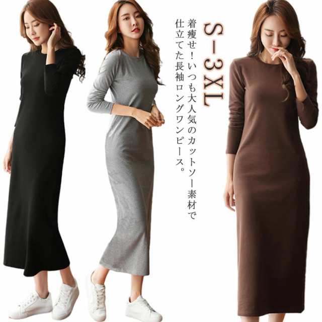 ワンピース Tシャツ ロングワンピース 無地 tシャツワンピース ロング カットソー 長袖 マキシワンピース 2XL 春 シンプル タイトワンピース 夏 秋 綿 グレー ブラック ブラウン 着?せ S M L XL ワンピース