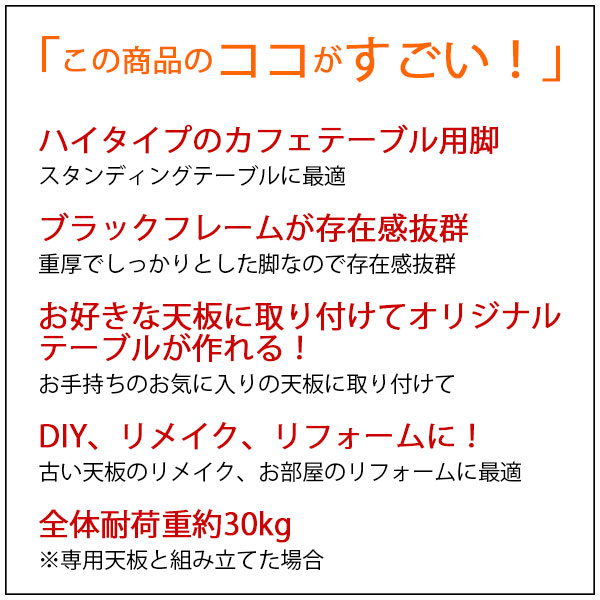 ※テーブル脚のみの販売ページです。 ・別売りの天板やお手持ちの天板を取り付けて、オリジナルのテーブルを作ることができます。 ・脚の高さは89.5cm。カフェテーブルやハイテーブルなどを作るのにおススメです。 ・スチール製の太いフレームは、しっかりと天板を支えるので安定感抜群! ※天板取り付け用のボルト(ネジ)は付属しておりません。あらかじめご用意をお願いいたします。 |
