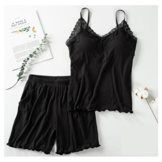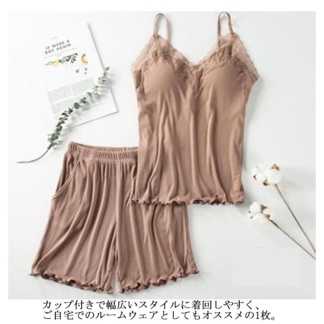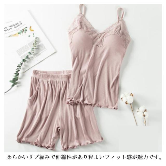 | 気軽に着られるキャミソールとショートパンツの2点セット。 クッション性のあるソフトカップ付き!ノンワイヤーなので、程よくフィット感がありながらもノンストレスな着心地です◎ 柔らかいリブ編みで伸縮性があり程よいフィット感が魅力です。 胸元にレースをあしらった大人の女性らしいデザインです。 ストラップには長さを調節出来るアジャスターが付いています。 ショートパンツはウエストゴムを使用。スマホの入るポケット付き。 透け感が気になるワンピースのインナーに重宝するキャミソール。カップ付きで幅広いスタイルに着回しやすく、ご自宅でのルームウェアとしてもオススメの1枚。 | |