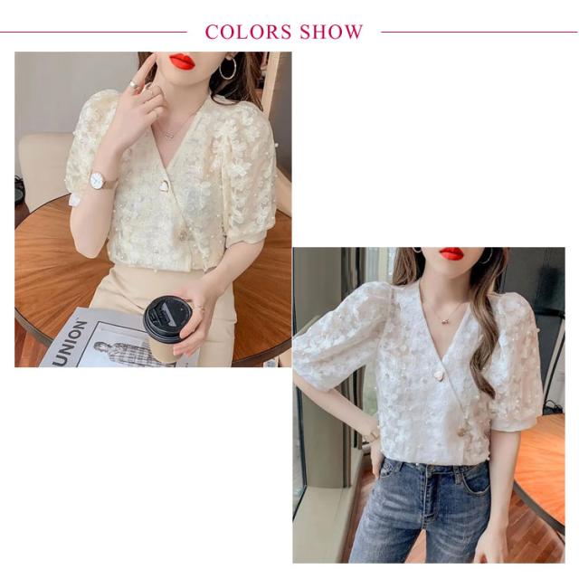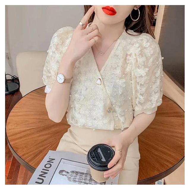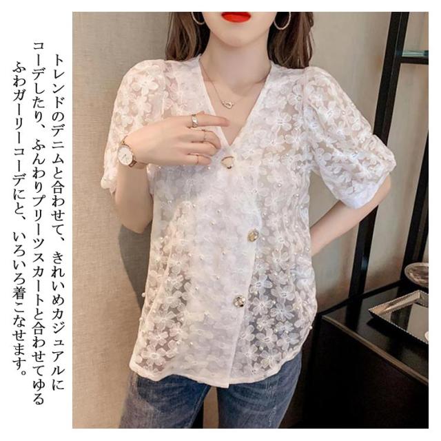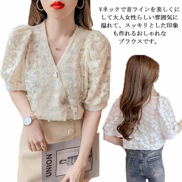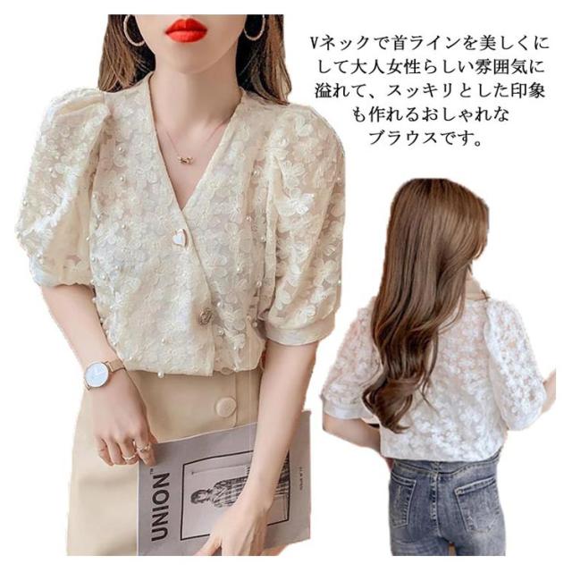 ブラウス 夏 半袖 トップス シャツ バルーンスリーブ 通勤 春 インナー お出掛け Vネック 普段着 大きいサイズ きれいめ 入学式 卒園式 レディース ベージュ ホワイト カジュアル 前開き