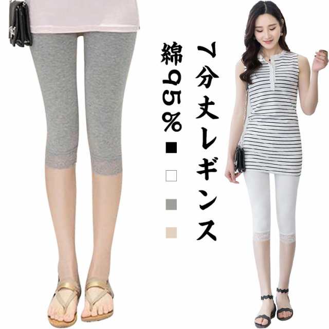 レギンス レディース コットン 夏 夏用 薄手 涼しい 7分丈 大きいサイズ スパッツ レース インナー ナチュラル LL 3L ヨガ ルームウェア ハーフレギンス 七分丈 黒 ブラック ホワイト グレー 送料無料