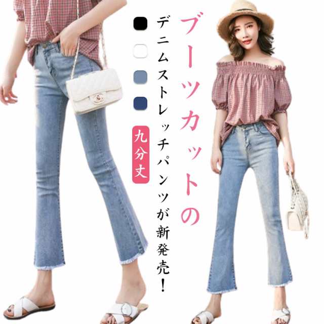 デニムパンツ レディース 裾フリンジ スキニーデニム 九分丈 春夏 秋冬 フレアパンツ デニム クロップドパンツ ジーンズ ジーパン アンクル くるぶし丈 ブーツカット ハイウエスト ストレッチ スキニー タイト おしゃれ 黒 白 ブルー 送料無料