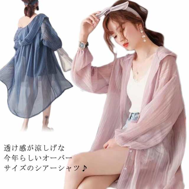 シアー 羽織り 抜け感 パーカー 袖ボリューム ブラウス ストライプ柄 ロング 韓国風 【送料無料】シアーシャツ 前後差 フード付き おしゃれ コーデ 体型カバー レディース 大人 きれいめ 春 夏 秋 透け感