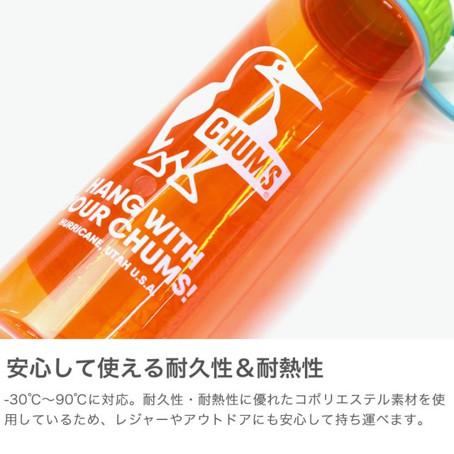 CHUMSらしいデザインを盛り込んだブービーボトル。耐久性・耐熱性に優れ、割れにくいコポリエステル製のボトルは、パッキンを使用しないでしっかりと密閉できる構造で衛生的。使用後のお手入れが楽ちんなのも魅力の一つです。たくさん水分補給したい時にも使いやすく、アウトドアシーンでの食品の収納や持ち運びにも活躍します。