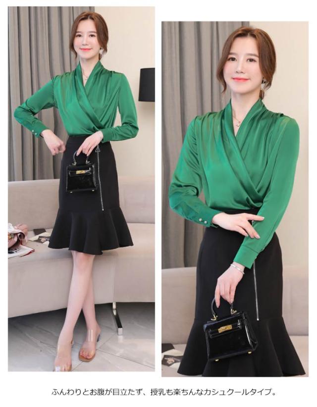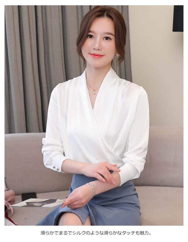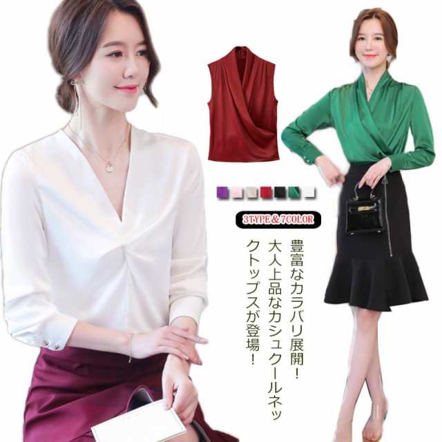 豊富なカラバリ展開!カシュクール Vネックブラウス レディース ブラウス シャツ トップス 長袖 ノースリーブ サテン調 Vネック OL オフィス フェミニン キレイめ 春 夏 秋 おしゃれ 送料無料