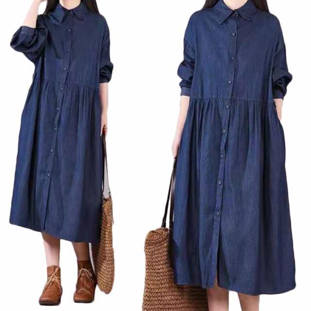 デニムワンピース レディース 無地 長袖ワンピ ロングワンピース シャツワンピース Aライン ミモレ丈 ワンピ フロントボタン 春秋 韓国系 ゆったり 大きサイズ 膝下 カジュアル