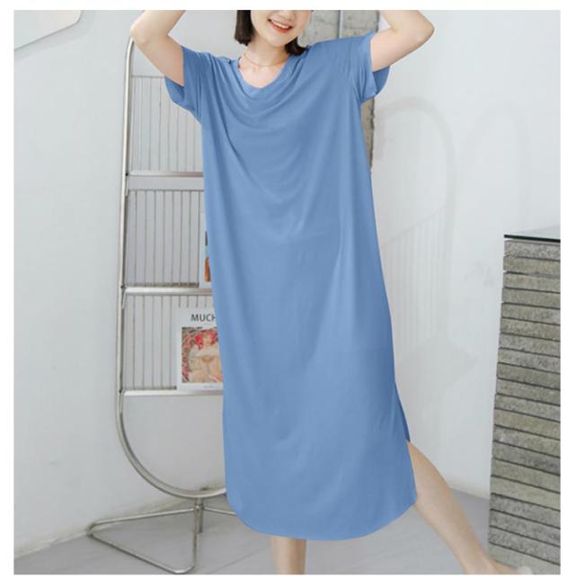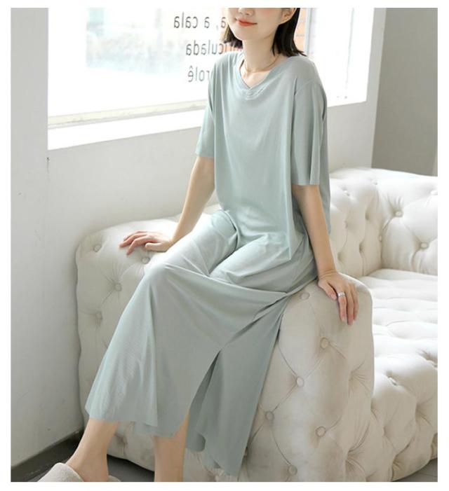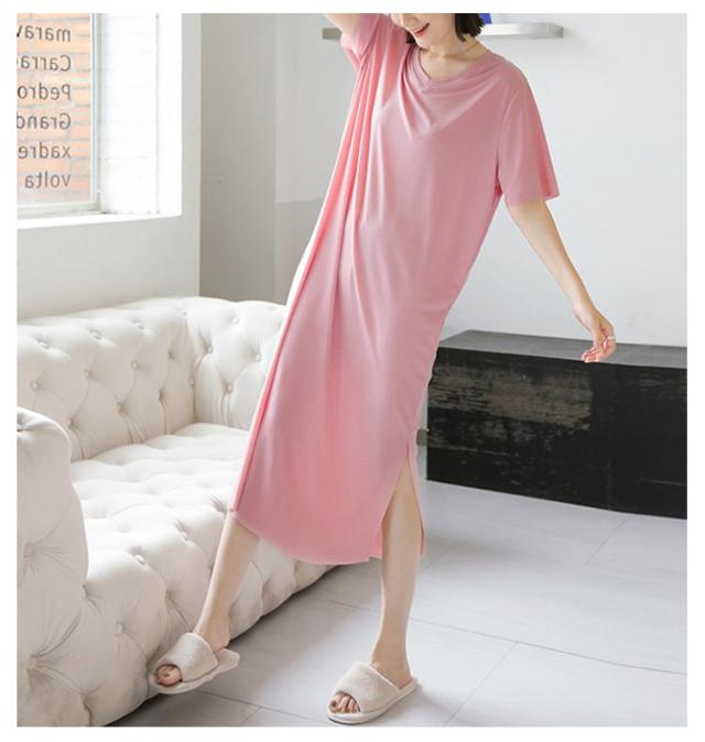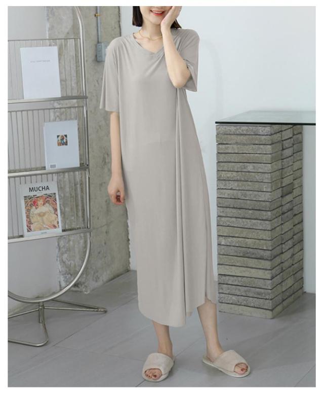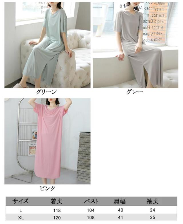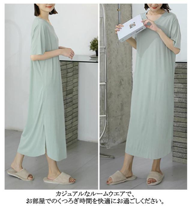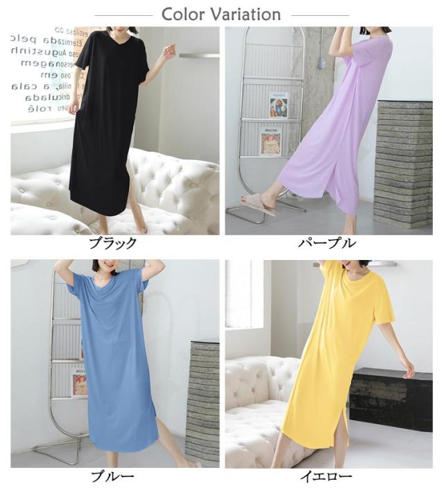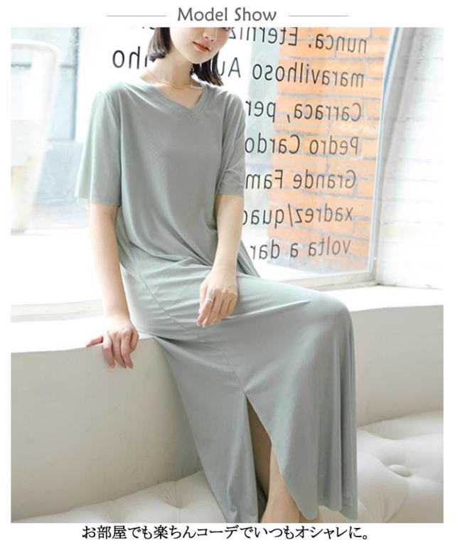 ワンピース 寝間着 パジャマ 半袖 丈 夏 接触冷感 部屋着 ミモレ ワンピース 寝巻き tシャツ ロンT ルームウェア ロング丈 丈 Vネック マキシ 接触冷感 涼しい リブ 裾スリット サイド スリット