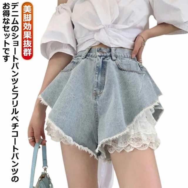 Gパン レディース ボリュームがかわいい 夏 デニムショートパンツ ボトムス ショートパンツ ハイウエスト ジーパン フリルペチコート付き フリルパンツ インナー レース ショート丈 パンツ aライン ショーパン ワイド デニムパンツ 可愛い お洒落 カジュアル