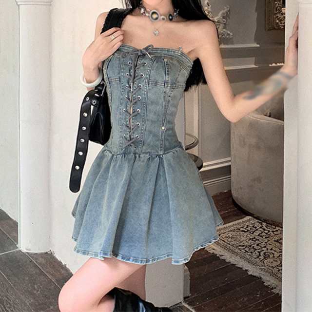 デニムワンピース レディース 夏 半袖 aライン チューブトップスカート ハイウエスト レトロ 個性的 きれいめ おしゃれ 着?せ カジュアル 低身長