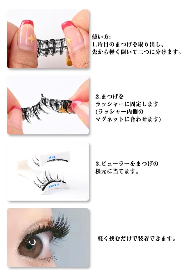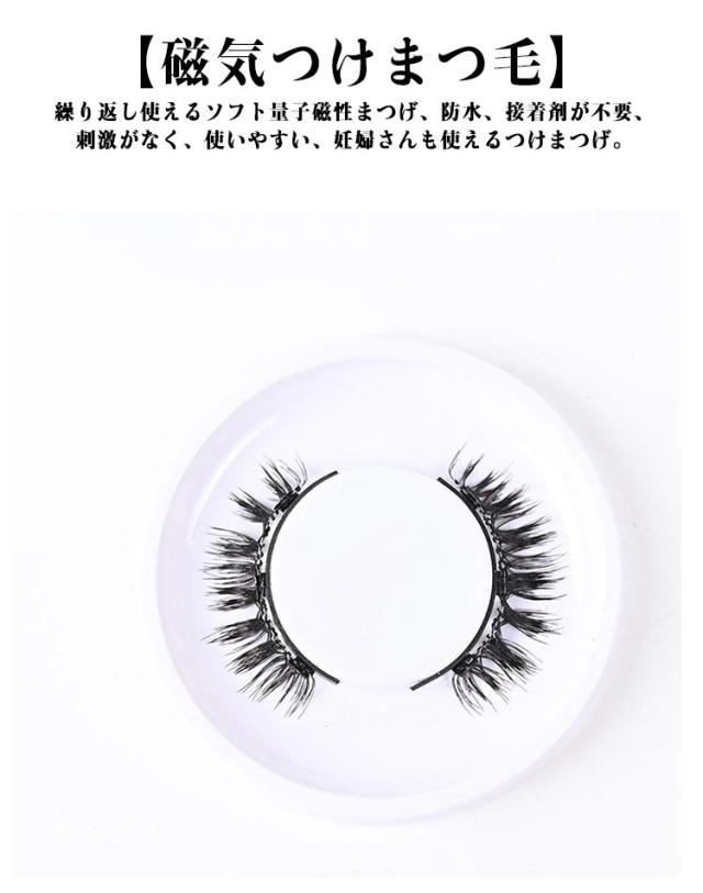 | 接着剤不要!!豪華なまつ毛に大変身! 磁気アイライナーには超微細な磁性粒子が含まれているため、まつげを簡単に付けておくことができます。 20種類のまつ毛が付いているのでシーンに合わせて使い分けできます。 【磁気つけまつ毛】 繰り返し使えるソフト量子磁性まつげ、防水、接着剤が不要、刺激がなく、使いやすい、妊婦さんも使えるつけまつげ。 接着剤を使わずに、手を使わずに、手軽にまつ毛を素早くつけることができます。 磁気ビューラーは良質のステンレス合金で作られており強力な磁気力を持っています。 磁気まつ毛を貼り付けるだけで、簡単に挟んで装着できます。 使い方:1.片目のまつげを取り出し、先から軽く開いて二つに分けます。2.まつげをラッシャーに固定します(ラッシャー内側のマグネットに合わせます)3.ビューラーをまつげの根元に当てます。軽く挟むだけで装着できます。 | |
