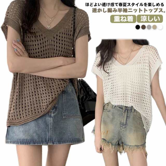 春 Vネック 半袖 シアー きれいめ 上品 透け感 ニットベスト トップス 大人 サマーニット レディース 夏 カジュアル 透かし編み メッシュ 半袖 フェミニン 韓国 春 夏 秋 レイヤード クルーネック 涼しい