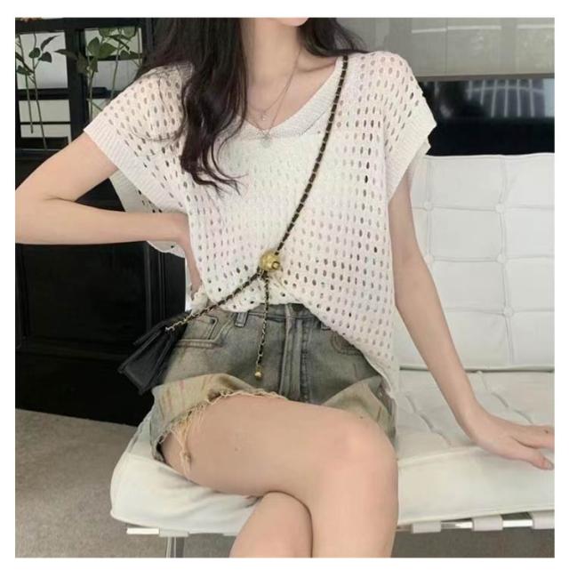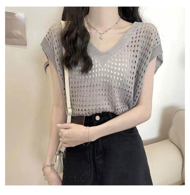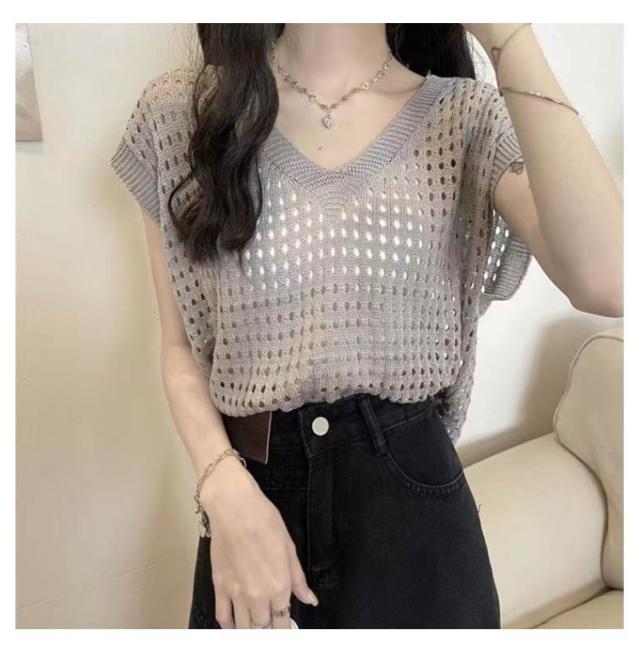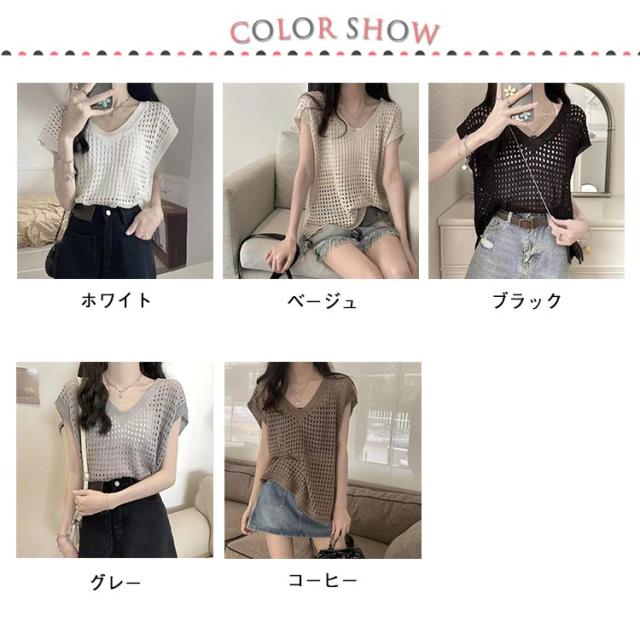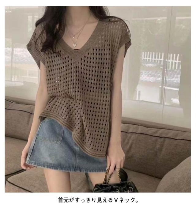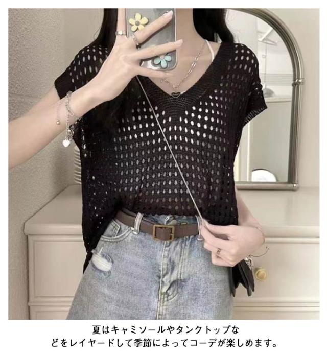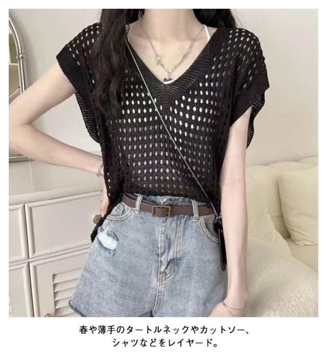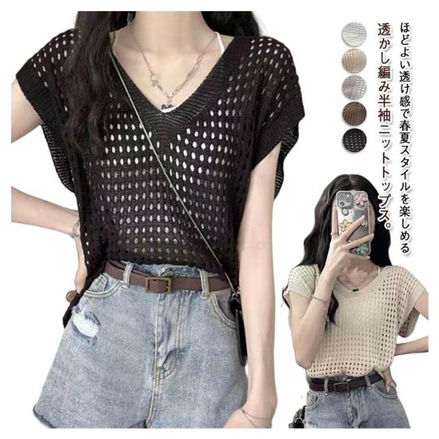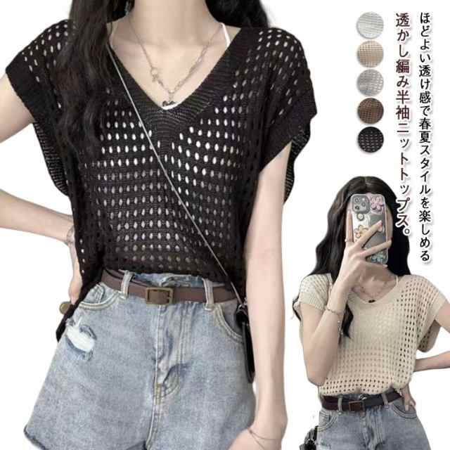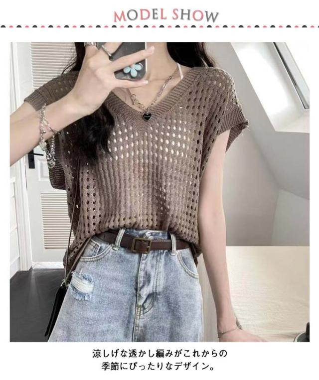 大人 透かし編み レディース トップス 春 メッシュ 重ね着 おしゃれ シアー 半袖 ニット 重ね着 トップス Vネック 夏 サマーニット 薄手 透け感 ゆったり セーター 無地 カジュアル ベスト レイヤード 上品 きれいめ 20代 30代