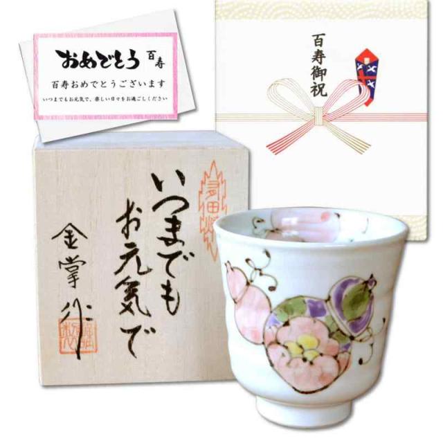 百寿のお祝い 無病息災を願った縁起物ギフト 有田焼 湯呑み 花六瓢 赤 のし・メッセージカード付き 木箱入り