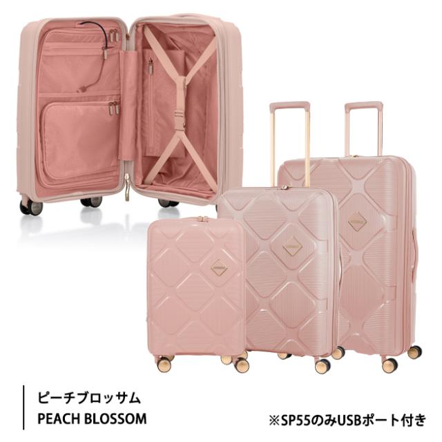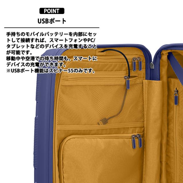 アメリカンツーリスター インスタゴン スピナー55 EXPは、機内持込対応のSサイズ(約35〜42L)キャリーケース。ファスナー操作で容量を拡張できるエキスパンダブル機能を備え、USBポートでモバイルバッテリー接続の充電にも対応。振動を吸収するOptimovサスペンションホイールでスムーズかつ静かな走行を実現します。内装は両面ディバイダー仕様で仕分けやすく、U字ポケットも便利。短期旅行や出張のスマートな移動に最適なリニューアルモデルです。