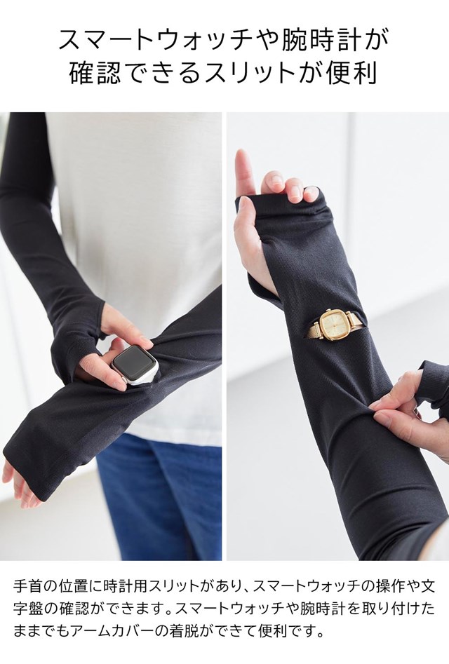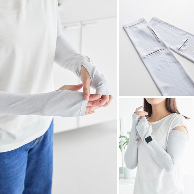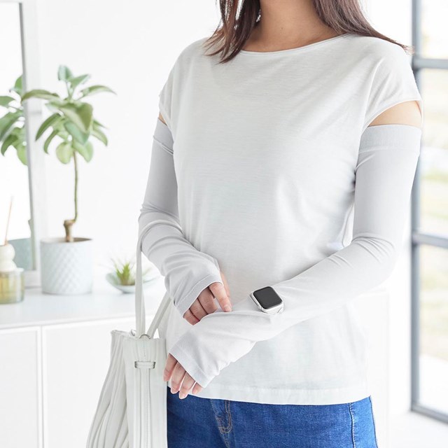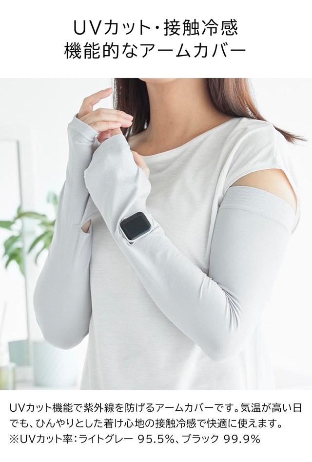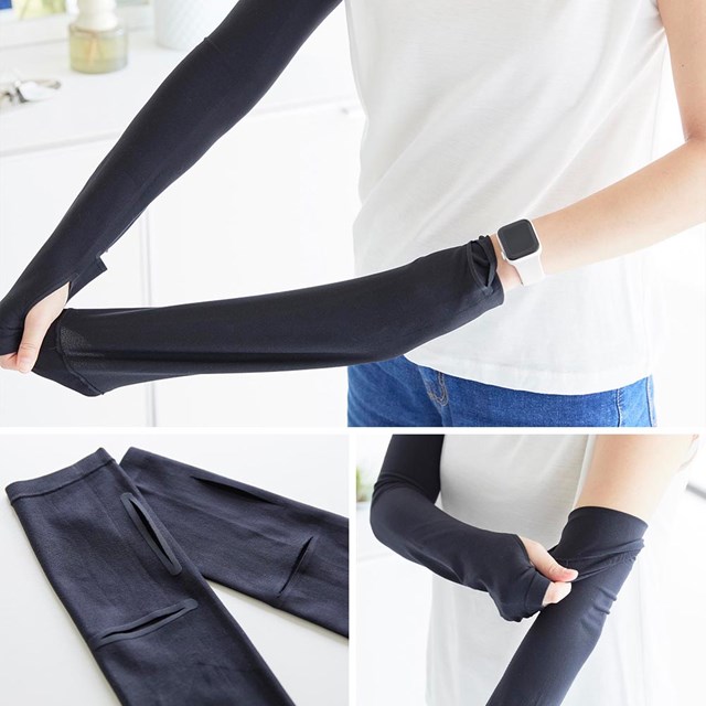 ロング丈なので二の腕まで紫外線対策ができ、 肌に触れた時にひんやり冷たい接触冷感機能付き。