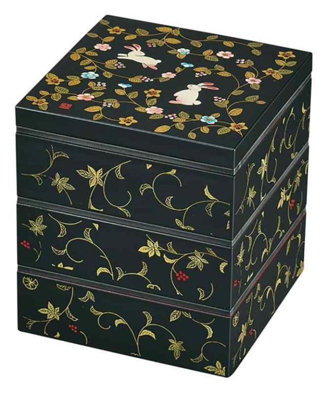 山中塗 花の小路 三段角重 (タッパ付) 黒 (15×15×17.2cm)