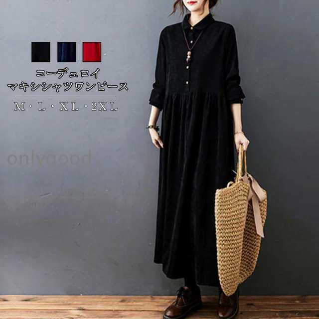 ロングワンピース レディース 春 コーデュロイ シャツワンピース ワンピース ロング丈 マキシ丈ワンピース 長袖 大きいサイズ 体型カバー オシャレ 春秋 20代 30