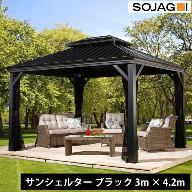 SOJAG ソジャグ メッシーナ ガゼボ サンシェルター 10×14ft ブラック アルミ製 屋根付き東屋 UVカット 耐候性 防水 防風 防錆 防虫ネット付 通気 二重屋根 BBQ テラス ガーデンパビリオン 屋根付きパーゴラ 組立式 おしゃれ モダン 庭 屋根 日除け 日よけ 頑丈 送料無料