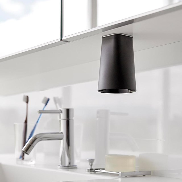 吊り戸棚下などにマグネットがつくフィルムシートを貼り付け、タンブラーを簡単に収納できます。