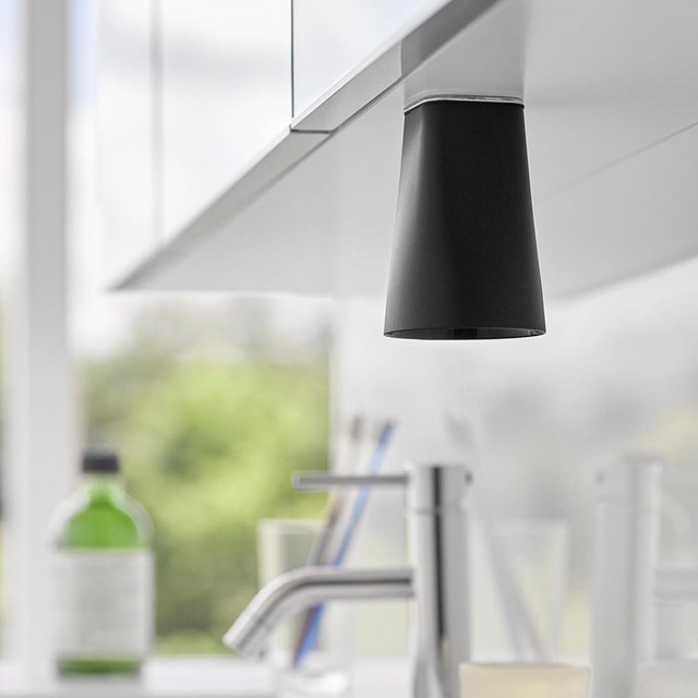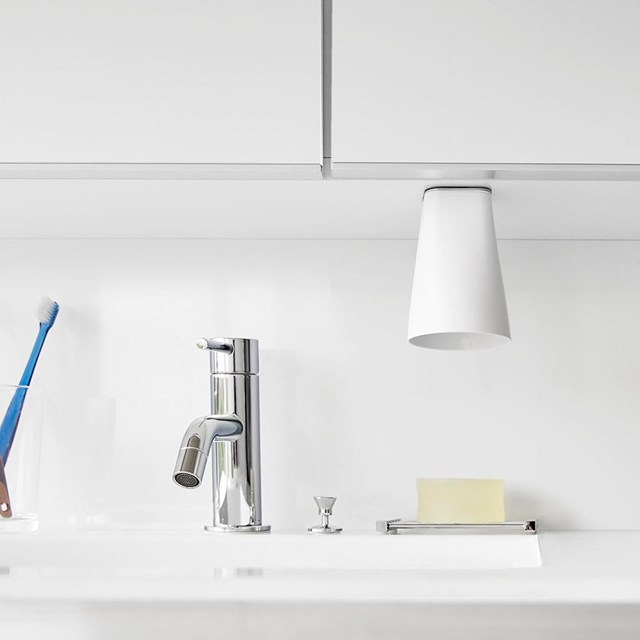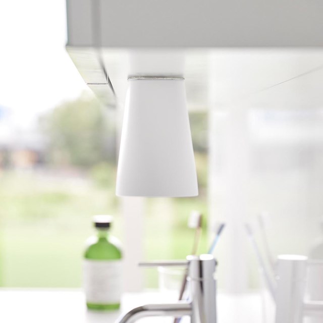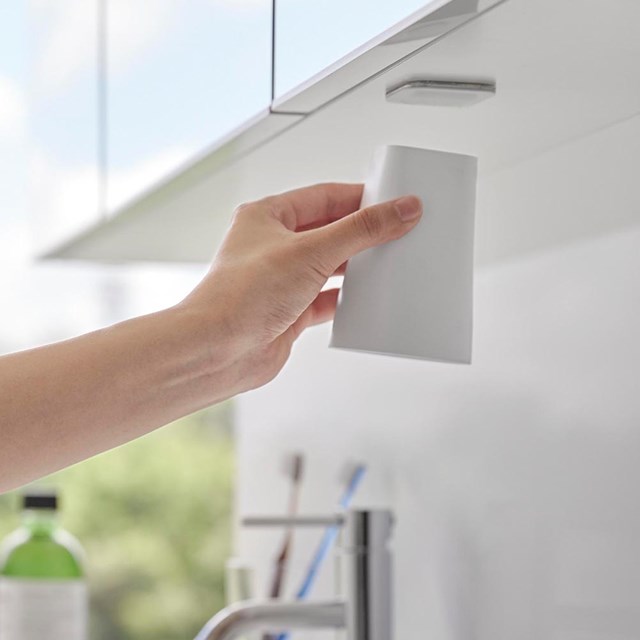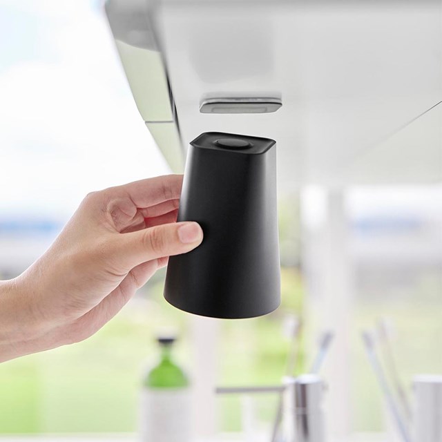 吊り戸棚下などにマグネットがつくフィルムシートを貼り付け、タンブラーを簡単に収納できます。 |