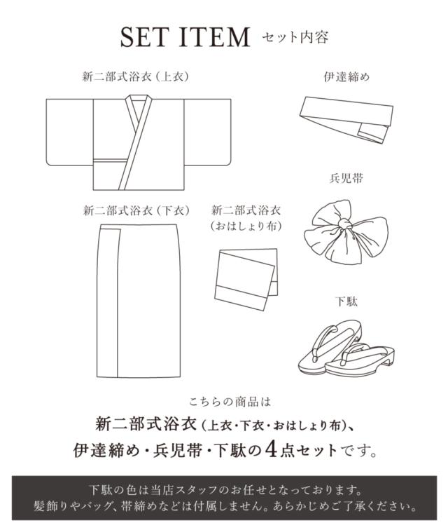 ※セットの下駄は、当店選別の「おまかせコーデ」です。台色や鼻緒の色柄のご希望は承りかねますのでご了承ください。