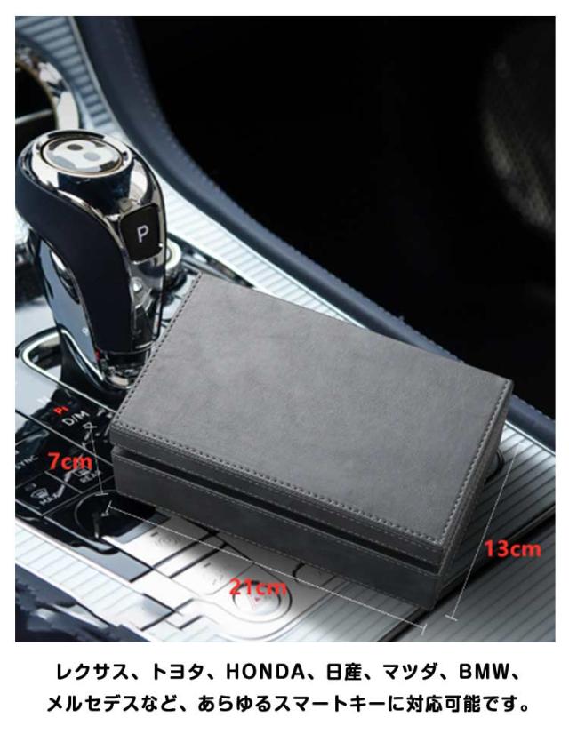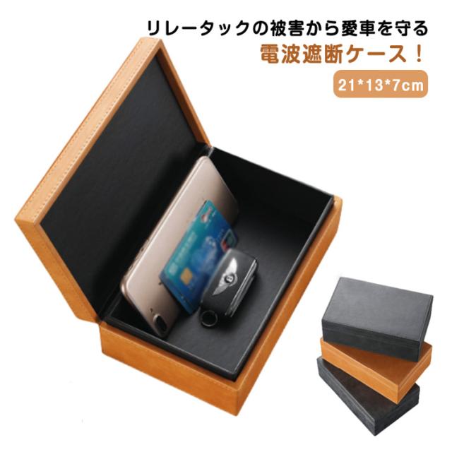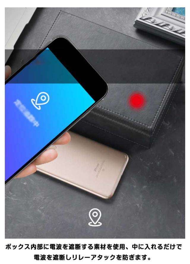 | リレータックの被害から愛車を守る電波遮断ケース! ボックス内部に電波を遮断する素材を使用、中に入れるだけで電波を遮断しリレーアタックを防ぎます。 あらゆるの信号を遮断できるので、自分の情報や財産などを保護することができます。 レクサス、トヨタ、HONDA、日産、マツダ、BMW、メルセデスなど、あらゆるスマートキーに対応可能です。 小物入れやオフィスや自宅での鍵の保管、クレジットカードなどのスキミング防止にもお使い頂けます。 プレゼント用の化粧箱を使用している為、そのままプレゼントにお使いいただけます。 | |