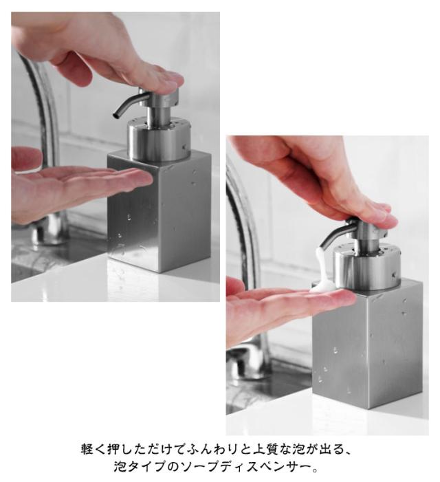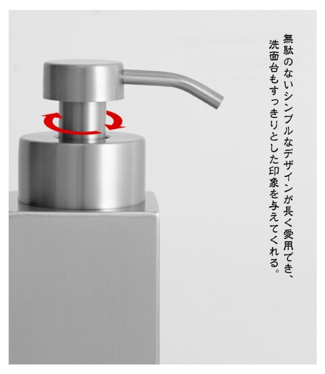 | 【ステンレス】【ソープディスペンサー】 スタイリッシュなステンレス製ソープディスペンサー。 軽く押しただけでふんわりと上質な泡が出る、泡タイプのソープディスペンサー。 きめ細かな泡は、手肌をやさしく洗いあげます。 無駄のないシンプルなデザインが長く愛用でき、洗面台もすっきりとした印象を与えてくれる。 | |