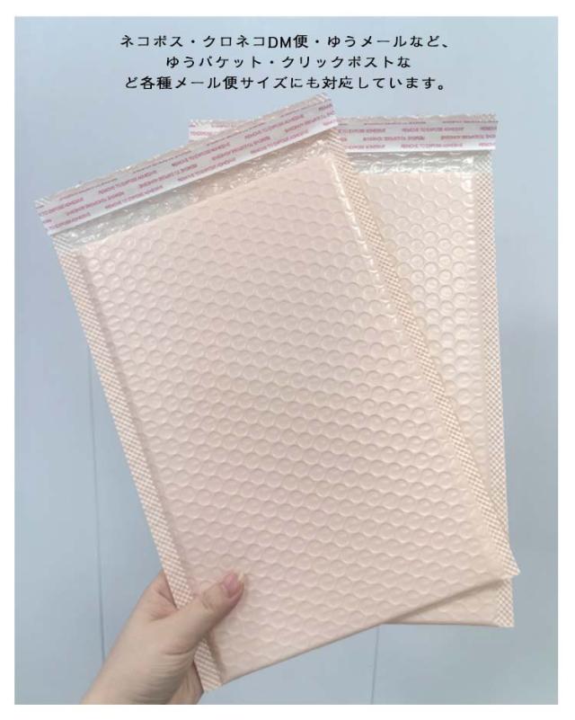 | 大切な商品を守るエアクッショ封筒。 衝撃を吸収するエアクッションで覆った封筒、緩衝材が不要で梱包代を抑えることができます。 強力な封緘テープが付いていますので手間なく、梱包作業の効率UP! 大切な商品を優しく保護し、小物・アクセサリーなどの発送に最適のクッショ宅配袋です。 マチが無いため、商品を入れる際に厚みによって内寸が変化します。 ネコポス・クロネコDM便・ゆうメールなど、ゆうパケット・クリックポストなど各種メール便サイズにも対応しています。 定番のホワイトはもちろん、シックなブラック、かわいいピンク、おしゃれなブルーやパープルなど計8色からお選びいただけるエアーキャップ入り配送袋です。 | |