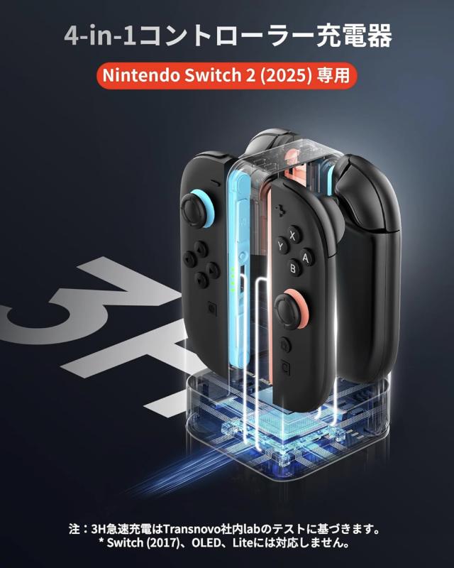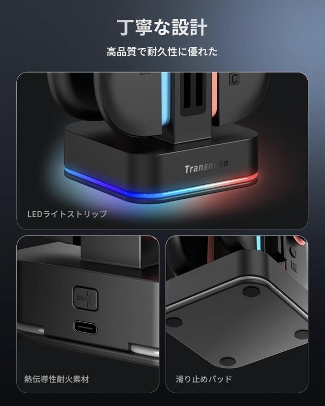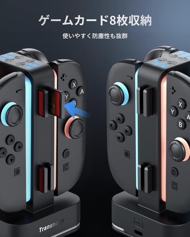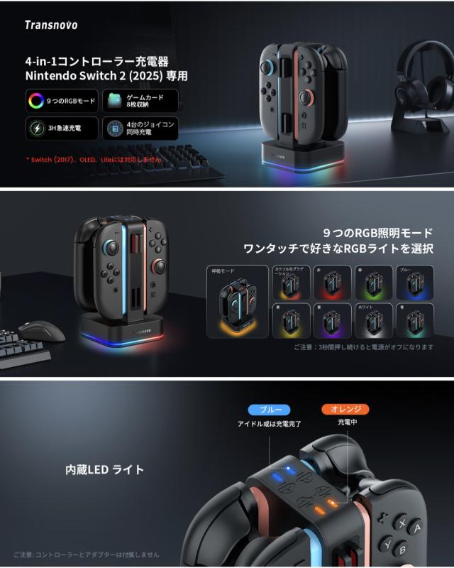 【2025新登場】TRANSNOVO Nintendo Switch 2 ジョイコン用 充電スタンド ニンテンドースイッチ2 用 4 in 1 急速 同時充電 コントローラードック ゲームカード8枚収納 LEDライト内蔵 9つのRGB ライト Type-Cケーブル付属 日本語取扱説明書 ブラック