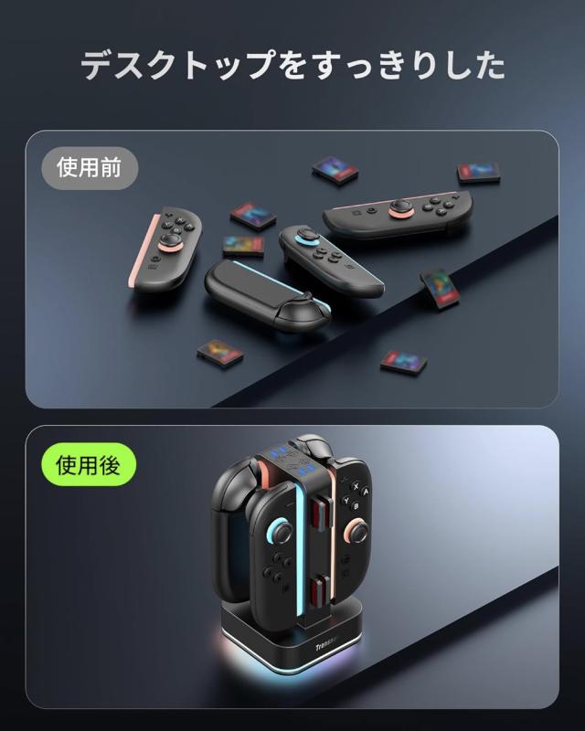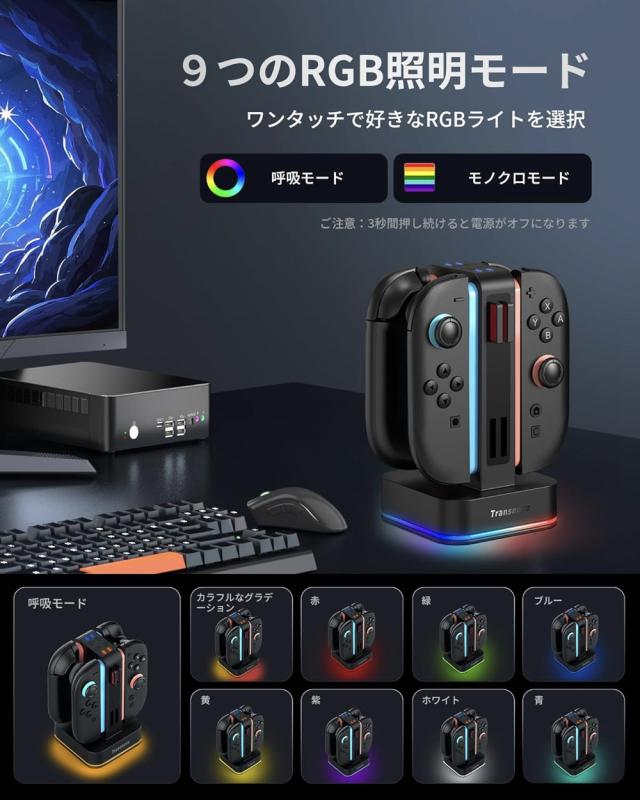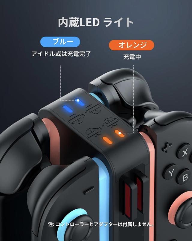 【4in1急速充電機能】2~3時間で4台のSwitch 2 ジョイコン コントローラーを同時に充電できます。従来のドックより30%高速です。コントローラーの交換やラウンド間で待機したりする必要はありません。パーティーゲーム、家族でのプレイ、ゲーム共有のセットアップに最適(USB-Cケーブル付属、Joy Conは付属しません)。ご注意:nintendo Switch 2 Joy Conのみと互換性があります、ほかのモデル対応できません。【磁気吸着・任意角度】この充電スタンドは磁気吸着設計を採用しており、ワンクリックでシームレスにフィットします。左右や上下を気にする必要がなく、4つの充電スロットは色や方向を合わせなくてもどの方向にでも挿入できます。区別する時間を節約し、より良いゲーム体験を提供し、非常に使いやすい。【充電指示LED・9つのRGB】充電対象を充電用のスロットに挿入するだけで、指示ランプが点灯します。アイドル或は充電完了はブルー、充電中はオレンジ色で、充電の状態を簡単に確認でき、充電状況が一目でわかります。また、ベースのボタンはワンタッチで9種類のRGBライトを切り替えることができ、お好みの雰囲気に調整できます(3秒間長押しするとRGBライトが切れます)。