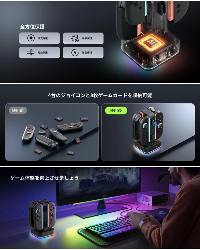 | Nintendo Switch 2 充電スタンド | 【4in1急速充電機能】 2~3時間で4台のSwitch 2 ジョイコン コントローラーを同時に充電できます。従来のドックより30%高速です。コントローラーの交換やラウンド間で待機したりする必要はありません。パーティーゲーム、家族でのプレイ、ゲーム共有のセットアップに最適(USB-Cケーブル付属、Joy Conは付属しません)。ご注意:nintendo Switch 2 Joy Conのみと互換性があります、ほかのモデル対応できません。 【磁気吸着・任意角度】 この充電スタンドは磁気吸着設計を採用しており、ワンクリックでシームレスにフィットします。左右や上下を気にする必要がなく、4つの充電スロットは色や方向を合わせなくてもどの方向にでも挿入できます。区別する時間を節約し、より良いゲーム体験を提供し、非常に使いやすい。 【充電指示LED・9つのRGB】 充電対象を充電用のスロットに挿入するだけで、指示ランプが点灯します。アイドル或は充電完了はブルー、充電中はオレンジ色で、充電の状態を簡単に確認でき、充電状況が一目でわかります。また、ベースのボタンはワンタッチで9種類のRGBライトを切り替えることができ、お好みの雰囲気に調整できます(3秒間長押しするとRGBライトが切れます)。 【ゲームカード収納可能】 内蔵ストレージには最大 8 枚のSwitchゲームカードを収納できます。お気に入りのゲームカードを整理して防塵します。充電スタンドを45°の角度に傾けてもゲームカードが落ちないので、紛失を防ぎます。ゲーム中にいつでも変更できるので便利です(ご注意:ゲームカードは付属していません) 【安全と充電保護】 システムは過充、過?、過熱、短絡に対する保護を提供し、強力で安全な充電を保証します。上記の状況が発生すると、インジケータライトがすぐにブルーに変わります。充電が完了すると過充電を防ぐために自動的に電源が切れます。夜中に眠っているときでもハンドルを保護し、寿命を延ばします。 |