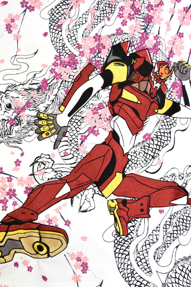 龍を纏ってダイナミックに蹴りを入れる弐号機の姿が刺繍で表現されています。