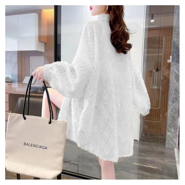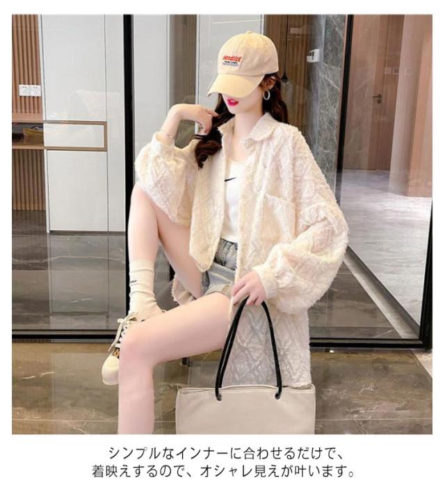 シア?シャツ ブラウス レディース ジャガード ゆったり 前開き 長袖 シアー シースルー 透け ビックシャツ トップス バルーンスリーブ 体型カバー オフィスカジュアル オケージョン 入学式 フェミニン