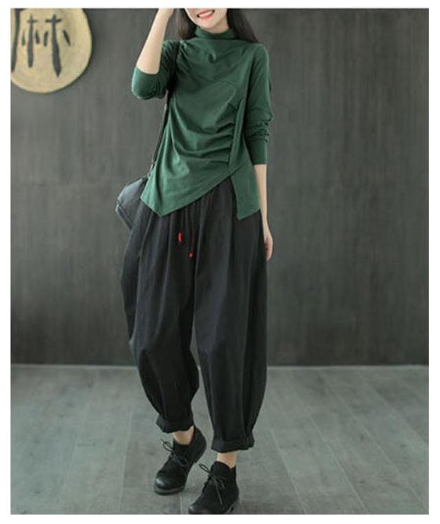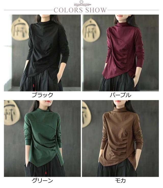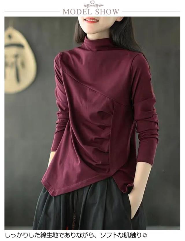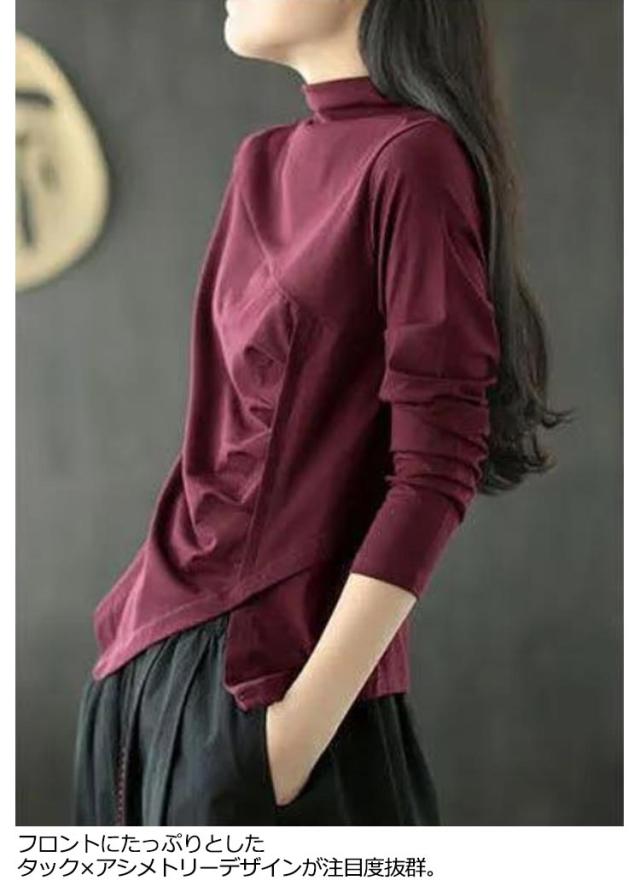 ハイネック 送料無料 綿100% 長袖tシャツ 秋 レディース カットソー コットン ハイネック 春 トップス タック ハイネックtシャツ タートルネック アシメトリー ナチュラル 無地 大きサイズ Tシャツ