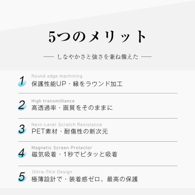高品質な素材(しなやかなPET)を使用しており、非常に高い透明度で、フィルムの存在を感じさせず、貼り付けたままでも画面本来の鮮やかな色合いや細部の美しさをそのままお楽しみいただけます。
