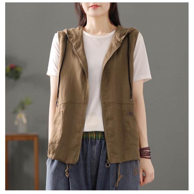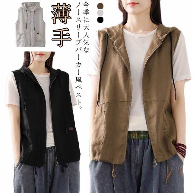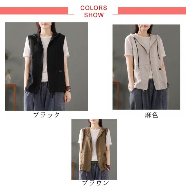 リネンベスト フード付き ジレ ベスト レディース 綿麻 パーカー ノースリーブ ジップアップ 薄手 フード付きベスト 麻 春 夏 秋 カジュアル