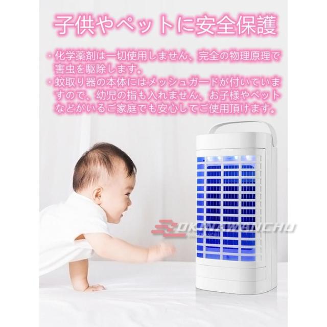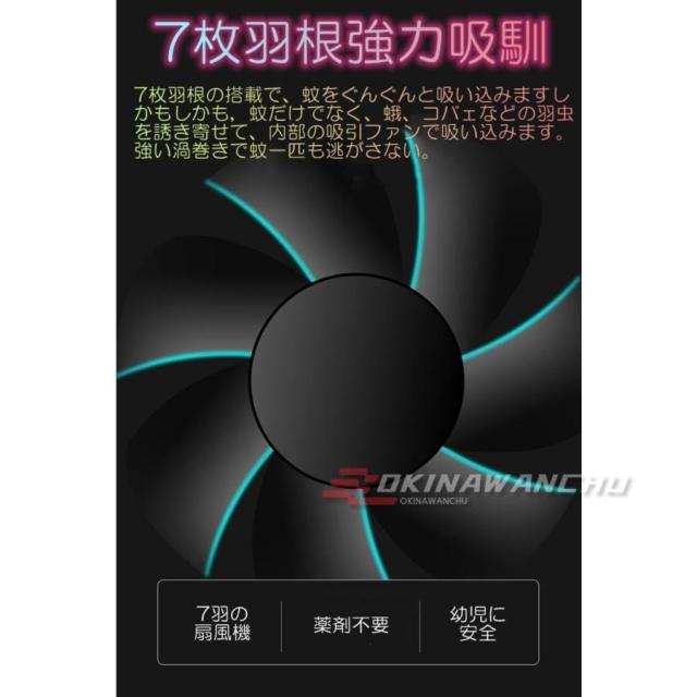 【電撃で強力殺虫】:強風吸引扇風機+光触媒技術+電撃三合一,蚊取り器に使用されているUVライトが誘虫効果のあるブルーカラーの近紫外線を発生する微熱と、光触媒によって発生する二酸化炭素で蚊をおびき出します。7羽の扇風機を内蔵して、より蚊を吸引して,しかも,蚊だけでなく、蛾、コバエ、?などの羽虫を誘き寄せて、内部の吸引ファンで吸い込んで、風化死滅させます。進化した電気蚊取り器は駆除原理は以前と同じで、扇風機、誘引灯の改善と電撃の改良により、殺虫効果は一層上がりました。蚊、コバエ等の羽虫が好む360-400nm波長の特集なuvライトで害虫を集めて来て、高圧電網でパシッと電撃与えて殺虫する電撃殺虫機、捕虫器蚊よけライトです。 光触媒誘虫灯虫取りライトの周りに、30周の電網があり、通電の時に高圧電流が流れて、UVライトに誘引されてきた蚊やコバエ等の害虫は電網に接触した瞬間で電撃されて網に張り付いてる状態で死んでしまいます。この夏に絶対欠かせない蚊対策グッズ。