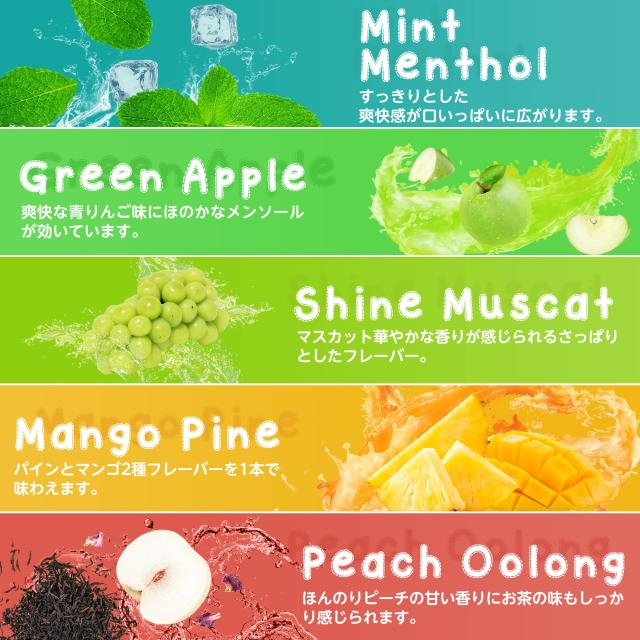 ★グリーンアップル: 爽快な青りんご味にほのかなメンソールが効いています。