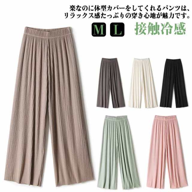 接触冷感 レディース 女性 プリーツパンツ ウエストゴム プリーツパンツ ボトムス プリーツパンツ 光沢感 パジャマ 縦ライン ウエストゴム ワイドパンツ 夏 夏服 涼しい パンツ 冷感 パンツ