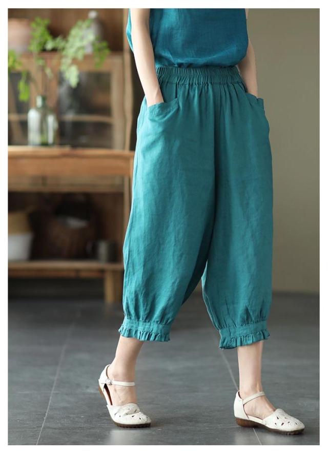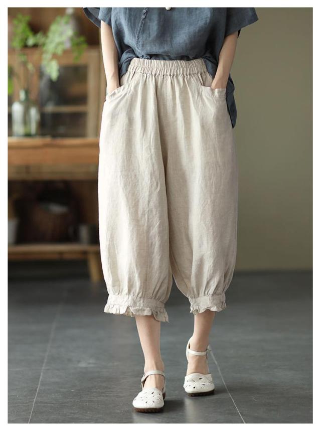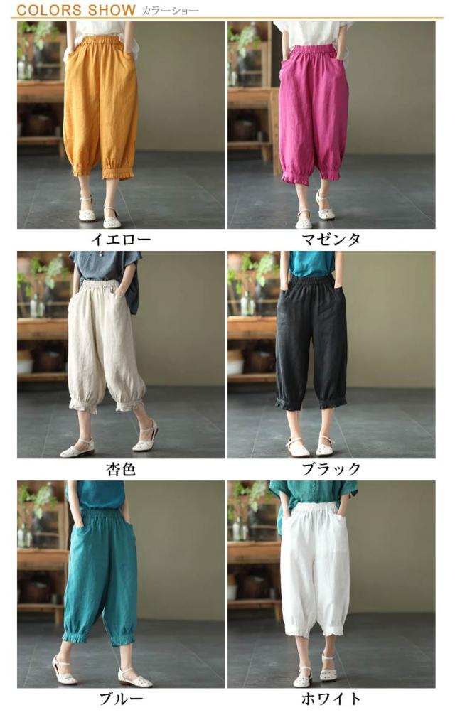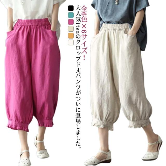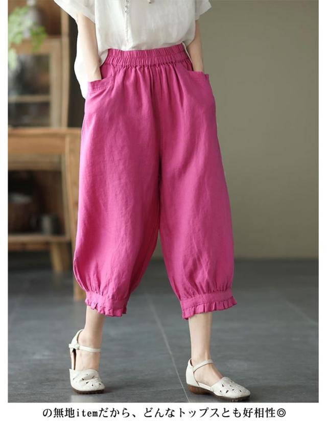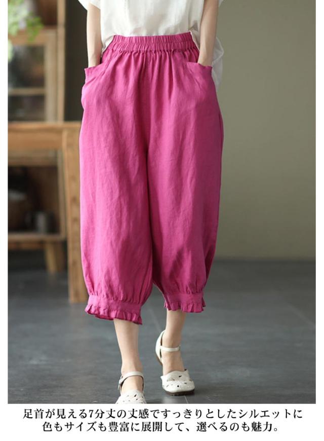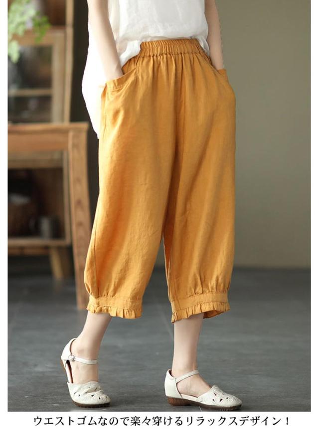 クロップドパンツ レディース サルエルパンツ 送料無料 七分丈 ワイドパンツ カジュアルパンツ 7分丈パンツ 薄ウエストゴム 裾フリル 薄手 夏用 春夏 シンプル 無地 体型カバー 楽チン
