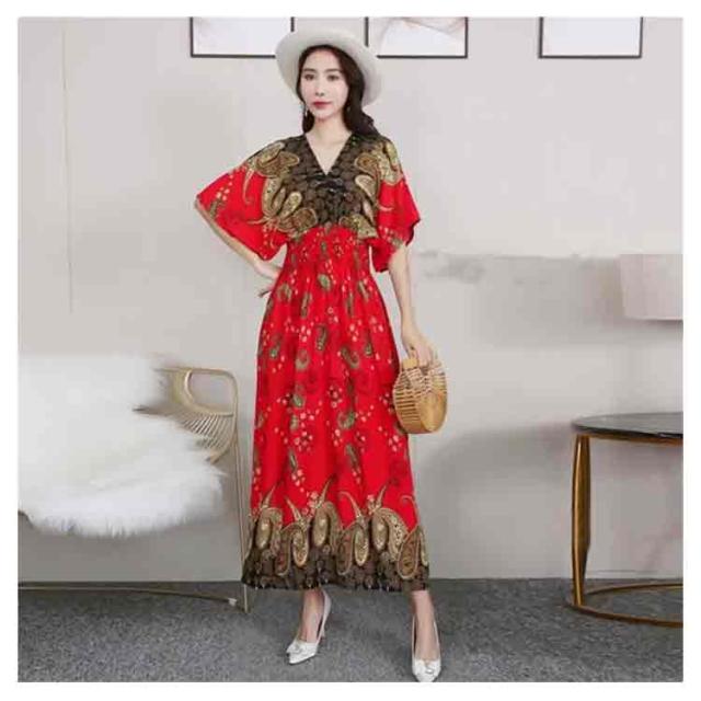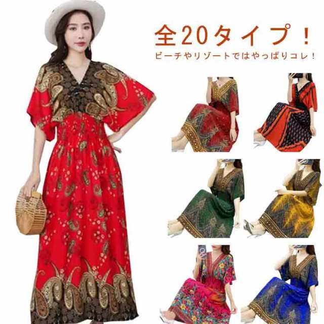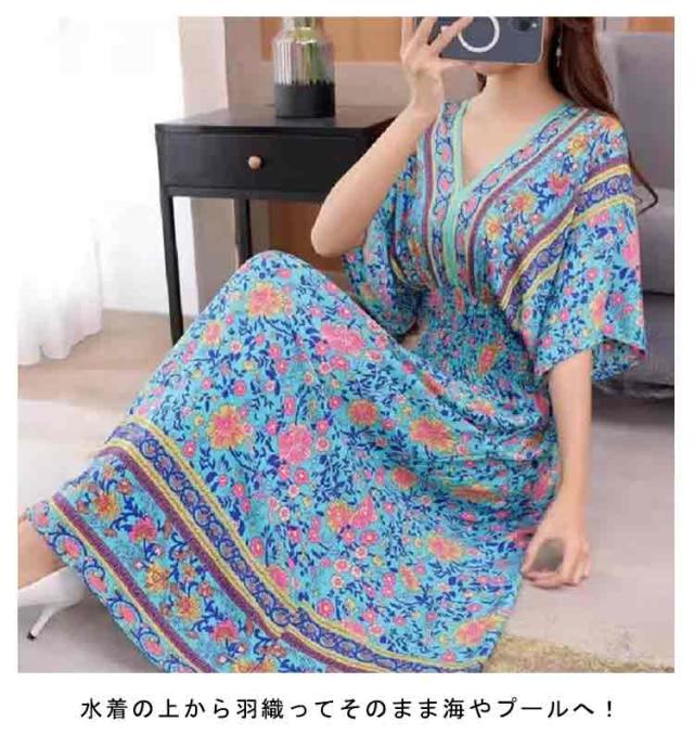 エキゾチック ワンピース 総柄 リゾートワンピース 海 Vネック 夏 花柄 マキシワンピース マキシワンピース ウェストゴム ロング 半袖 マキシ丈 柔らかい アジアン ロングワンピース 個性的 ロング丈 おしゃれ きれいめ エスニック 花柄