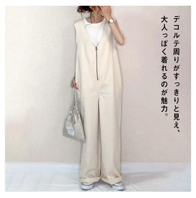 フロントジップ レイヤード風 サロペットパンツ 冬 オールインワン ワイドパンツ オーバーオール レディース ゆったり ロングパンツ 全4色 リラックス 大人カジュアル ルーズ 春秋 オーバーオール 大きいサイズ 深Vネック
